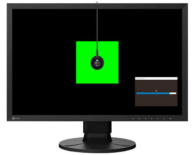El colorímetro EX5 se conecta al ordenador mediante USB. A continuación, ColorNavigator 7 o Quick Color Match proyectan una secuencia de diferentes campos de color en el monitor, que son medidos por el EX5. De este modo se comprueba si la visualización del color del monitor sigue correspondiendo a los valores objetivo establecidos o si ha cambiado debido a factores como el envejecimiento.